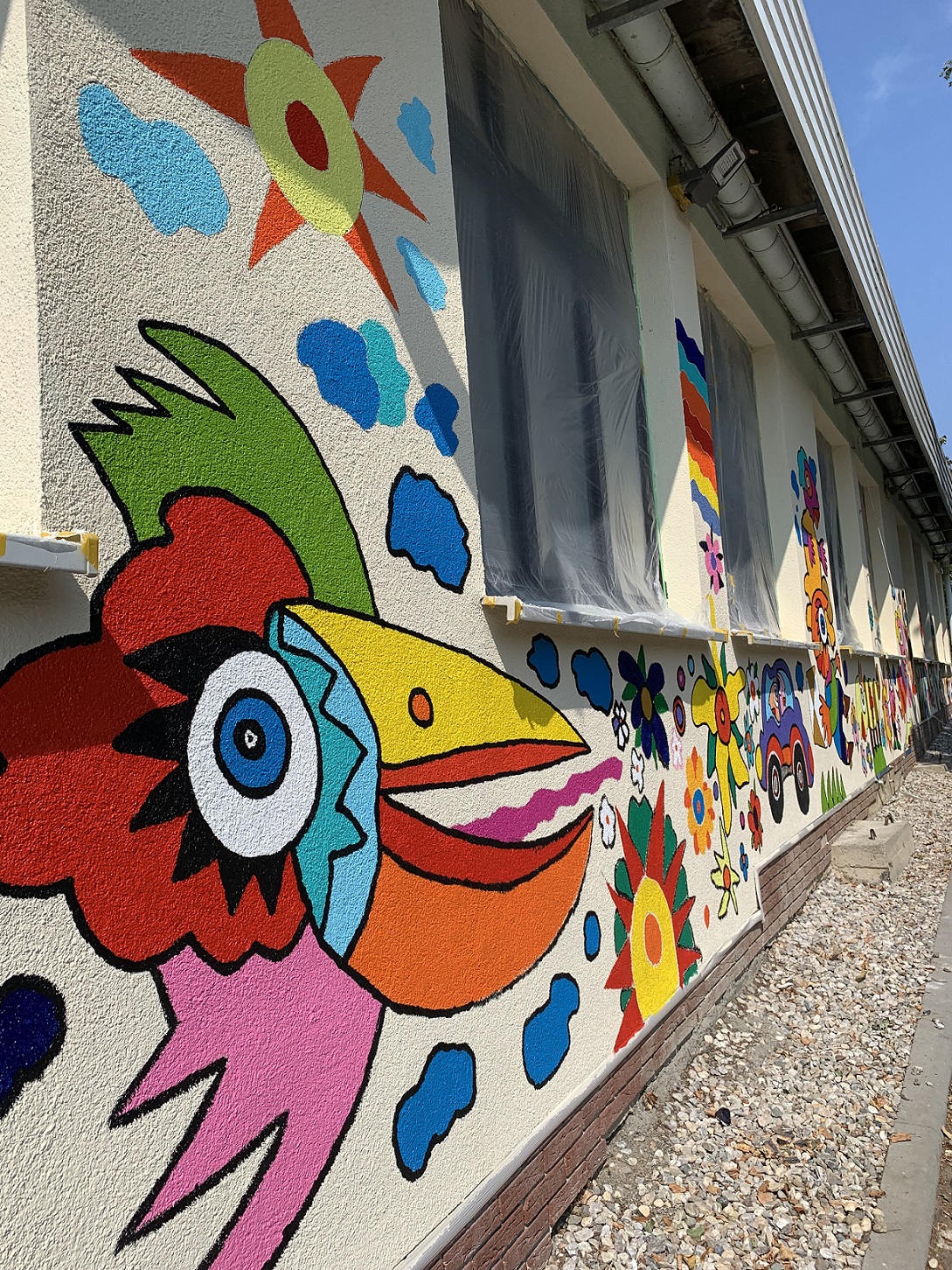 Dass neben einer guten Idee immer auch eine ordentliche Portion Mut, Beharrlichkeit und vielleicht etwas Verrücktheit dazugehören, um Großes zu schaffen, bewies an diesem Tag auch unsere Kunstlehrerin: Auf ihre Initiative hin hatten wir auf unserem Fest im kleinen Püchau den bekannten deutschen Maler Michael Fischer-Art zu Besuch, der gemeinsam mit den Gästen die Fassade unserer Schule herrlich bunt bemalte! Ob Kinder oder Erwachsene – alle, die Lust hatten, waren an diesem Tag eingeladen, unsere Schule selbst mitzugestalten – ganz so wie wir täglich mit den Schülerinnen und Schülern unsere Lernumgebung gemeinsam gestalten…